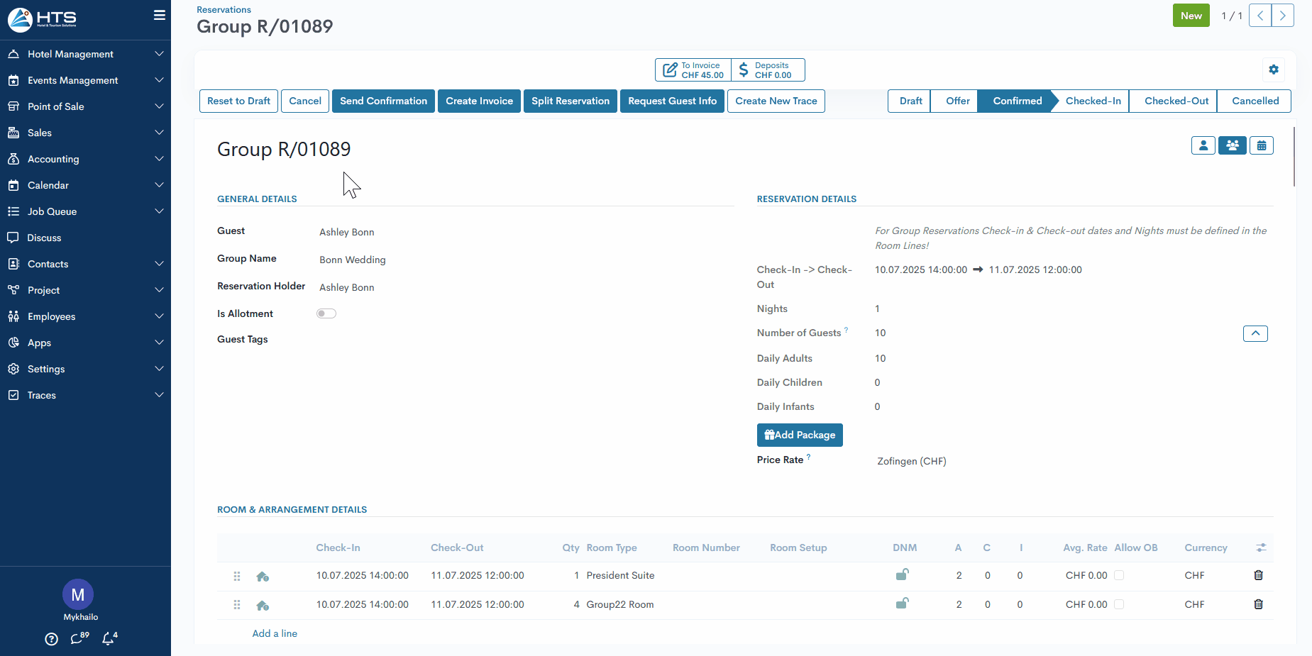 Die intelligente "Abzurechnen" Schaltfläche ist für den User nur verfügbar, wenn der Status der Reservation "Bestätigt" oder "Checked-In" ist.