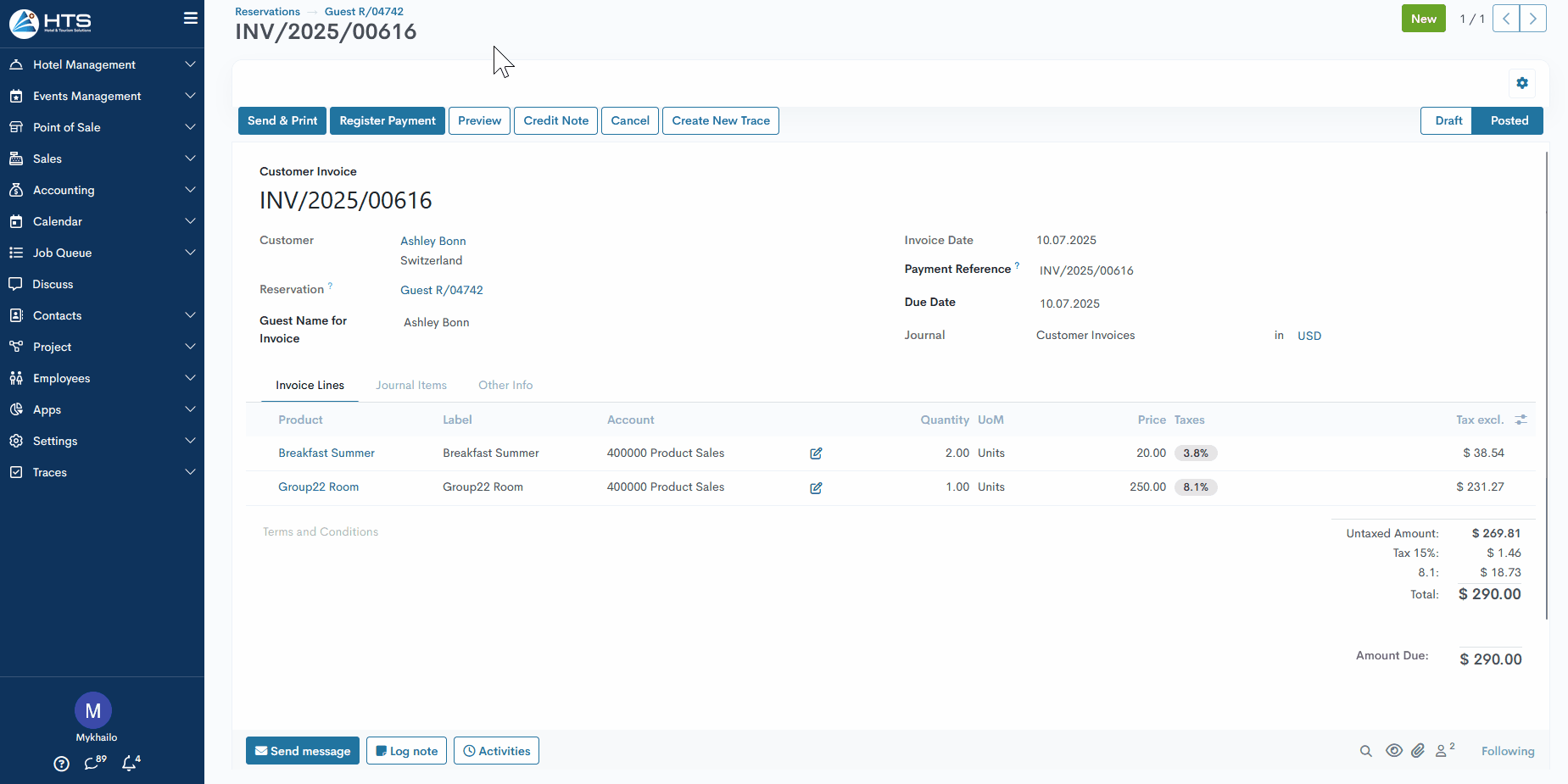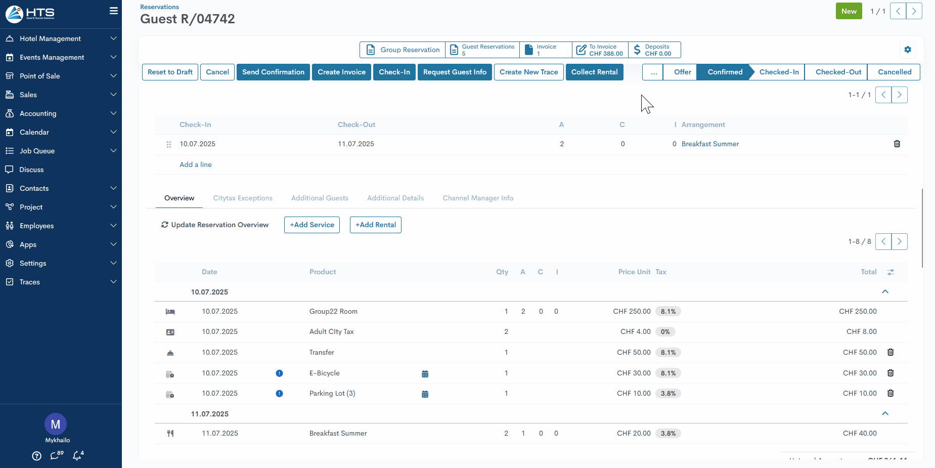 Die erstellte Rechnung kann über die Smart-Schaltfläche „Rechnung” aufgerufen werden, wobei die Ziffer die Gesamtzahl der mit einer bestimmten Reservierung verbundenen Rechnungen angibt. Sobald die Rechnung erstellt wurde, passt das System die Schaltfläche „Rechnung erstellen” an, um den noch ausstehenden Rechnungsbetrag anzuzeigen.