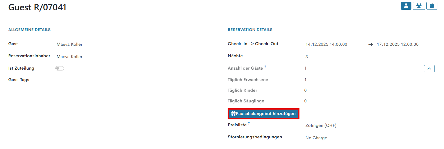 Klicken Sie in der Reservationsmaske im Abschnitt Reservationsdetails auf die Schaltfläche Pauschalangebot hinzufügen.