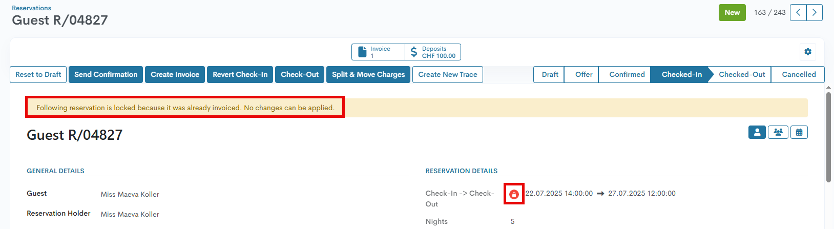 Wenn alle Artikel in Rechnung gestellt sind, wird die Reservation mit einem "Gesperrt" Stichwort versehen, das Änderungen, wie Zimmer, Arrangements, Städtesteuer Produkte, und weitere Aspekte nicht länger vorgenommen werden können. Der Text dieser Nachricht ist anpassbar - erfahren Sie weitere Details in diesem Artikel.