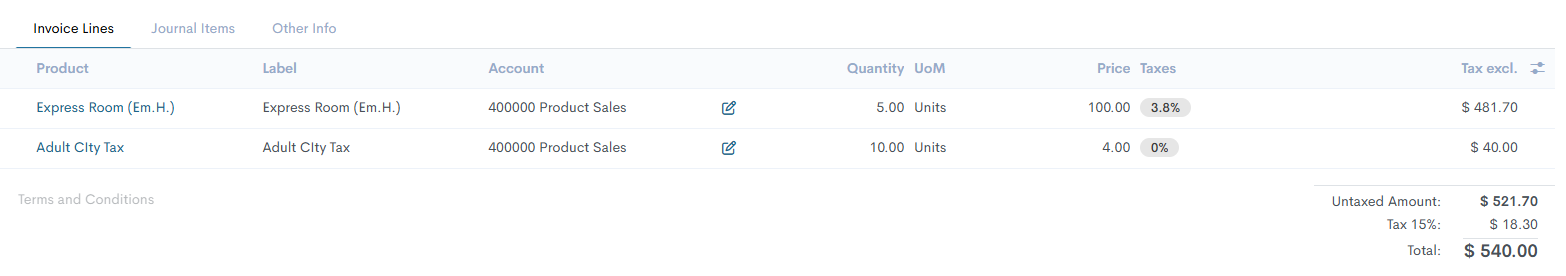 Das System erstellt eine Rechnung mit dem Status "Verbucht". In diesem Status können keine Änderungen zur Menge, Name, oder Preis des Produkts vorgenommen werden. Alle abgerechneten Produkte sind nach folgendem Schema gruppiert: Falls der Name, Preis, und Steuer gleich sind, werden diese Produkte zusammen gruppiert. Wenn nur eines dieser Kriterien verschieden ist, gibt es einige Zeilen.