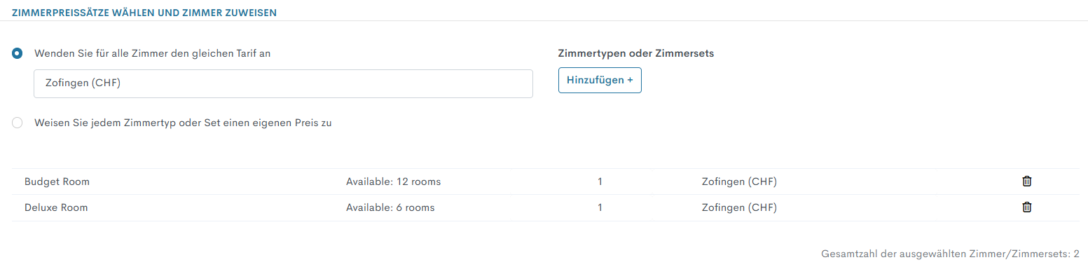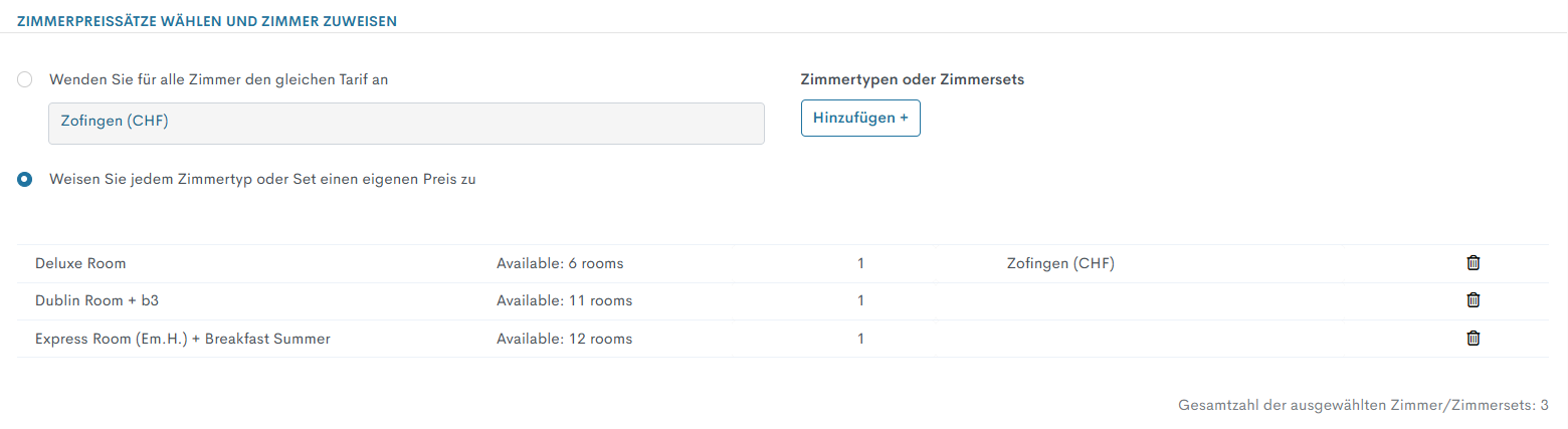 Für jeden Zimmertyp oder jedes Set eine separate Preisrate zuweisen