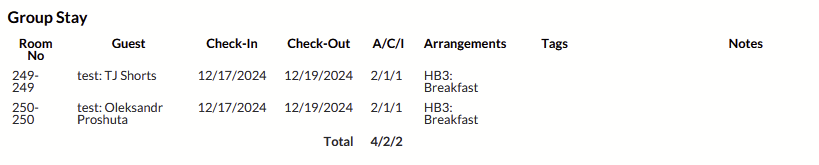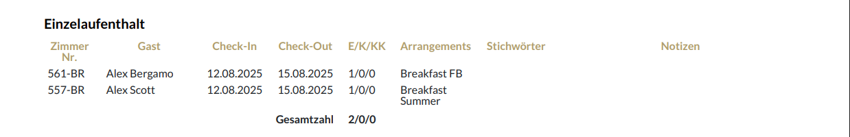 - Individueller Aufenthalt - Abschnitt für die Gästereservationen. Die folgenden Informationen werden bereitgestellt - Zimmernummer, Gastname, Buchungsdaten, Anzahl Gäste, Name des Arrangements, Stichworte und Anmerkungen;