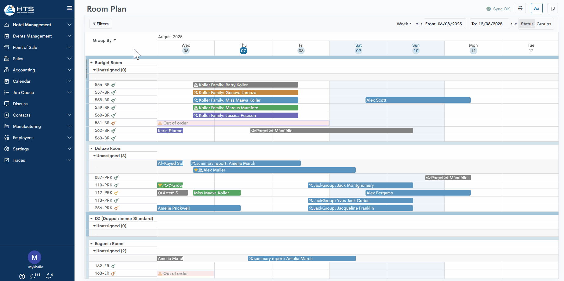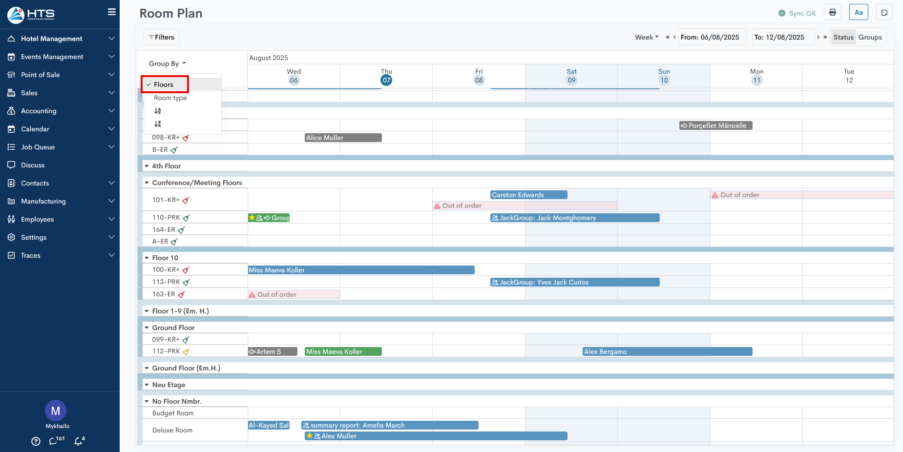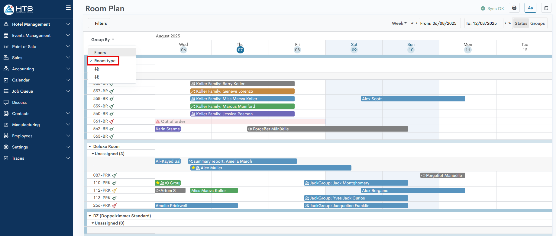 The room plan allows the user to group or sort reservations based on their specific needs. The Group By button is located under the Filters and have a few options for grouping and sorting. When grouping or sorting, the system always displays hotel rooms first, followed by event rooms, and finally property items.
