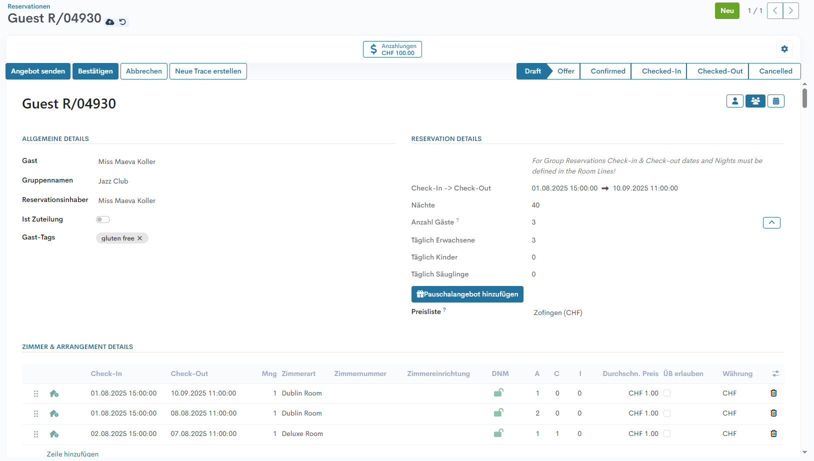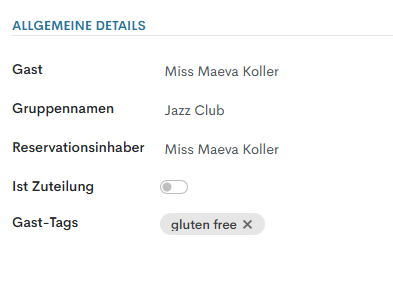 In diesem Abschnitt werden alle Informationen über Reservationsdaten, Anzahl Gäste, Zimmerarten usw. angegeben: