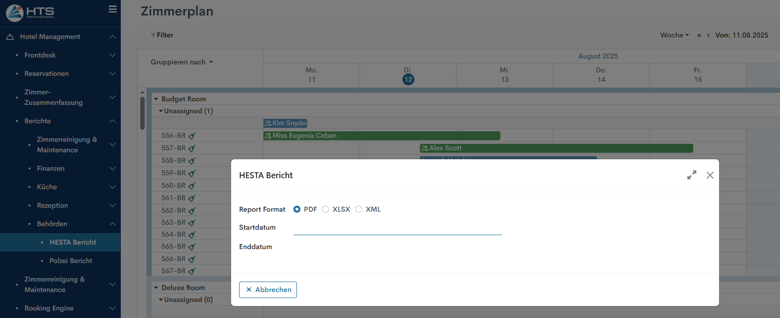 Alle Hotelberichte sind auf der Registerkarte "Berichte" im Modul "Hotel Management" verfügbar. Diese Berichte sind in verschiedene Abschnitte unterteilt - Küchenberichte, Front Office, Finanzen, etc. Um einen HESTA-Bericht zu erstellen, gehen Sie folgendermaßen vor: