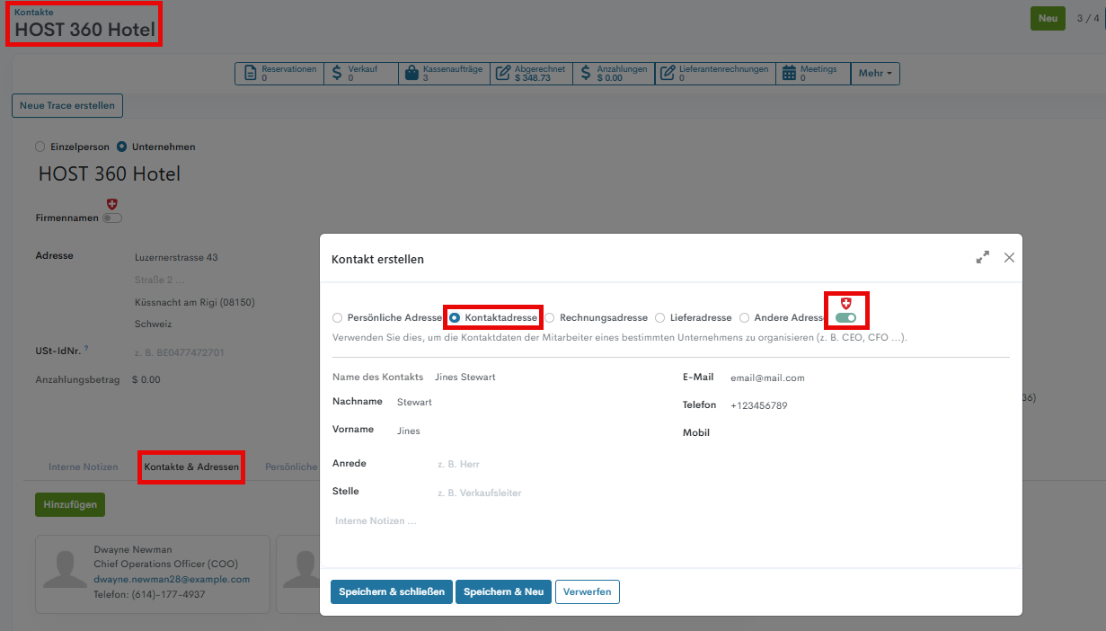 Informationen zur Kontaktperson im Hotel, die als HESTA-Kontakt markiert und im Tab Kontakte & Adressen auf der Hotel-Kontaktseite hinzugefügt wurde.