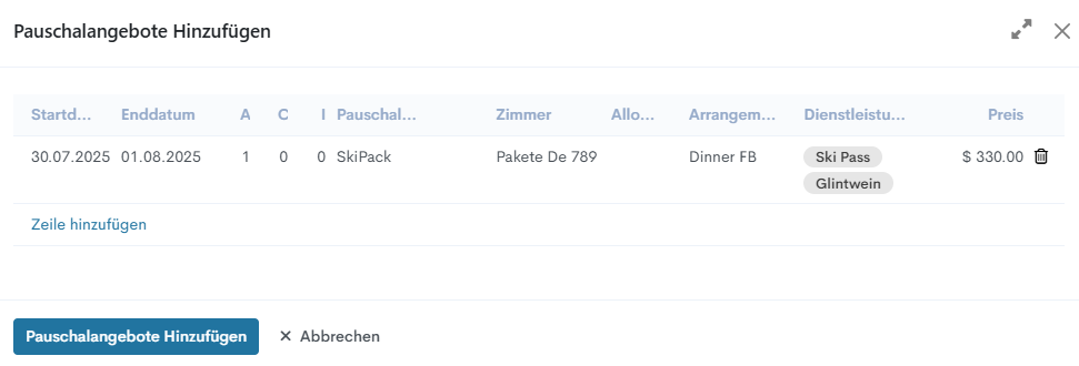 Falls nötig ermöglicht das System das Hinzufügen von mehr als einem Pauschalangebots - klicken Sie einfach erneut auf „Zeile hinzufügen“ und folgen Sie den obigen Schritten. Wenn alle Pakete zum Assistenten hinzugefügt wurden, klicken Sie auf „Pauschalangebote hinzufügen“ - das System erstellt Zimmer- und Arrangement-Zeilen und berechnet auch alle Produkte im Abschnitt „Übersicht“ aufgrund der Einstellung „Preisanwendbarkeit“ während der Einrichtung der Pauschalangebote.