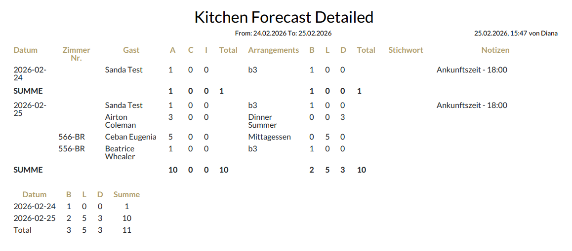 Am Ende jedes Tages wird in einer Zeile „SUM“ die Gesamtzahl der Gäste (A/C/I) und Mahlzeitenarten (B/L/D) zusammengefasst. Darüber hinaus wird am Ende des Berichts eine Übersichtstabelle für den gesamten Berichtszeitraum angezeigt.