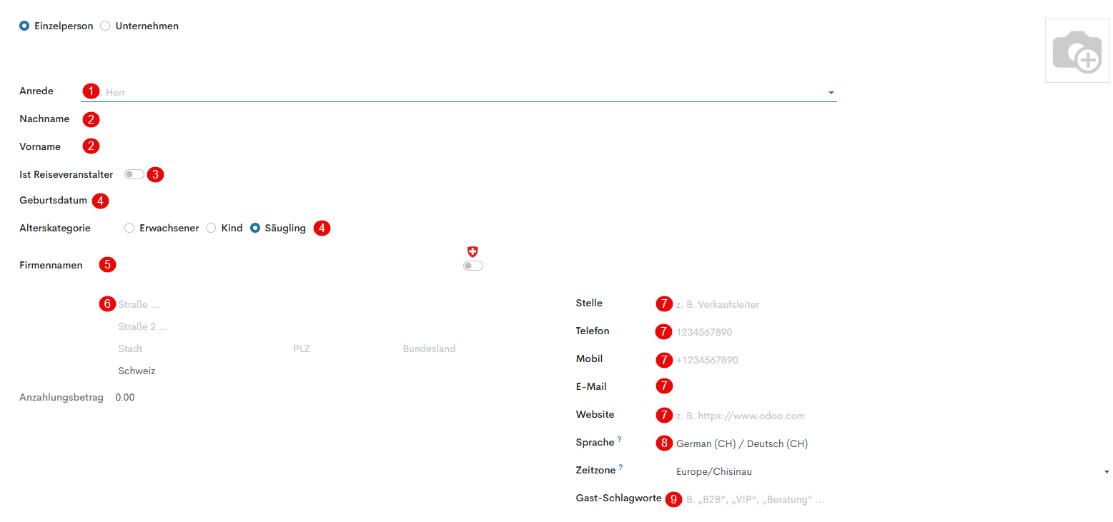 Bei den Kontaktinformationen des Firma ist die Maske recht ähnlich - es gibt keine Felder "Titel", "Vorname", "Nachname", "Reisebüro" und "Altersgruppe". Füllen Sie stattdessen das Feld "Firmenname" aus, während die übrigen Felder unverändert bleiben.