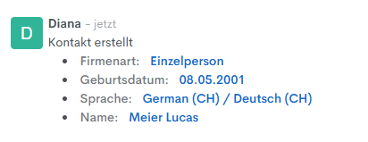 Sobald der User alle erforderlichen Informationen eingegeben und die Änderungen gespeichert hat, ist ein neuer Kontakt erfolgreich erstellt. Alle hinzugefügten Daten können in der Änderungshistorie in Chatter eingesehen werden, und alle zukünftigen Änderungen werden dort ebenfalls dokumentiert.