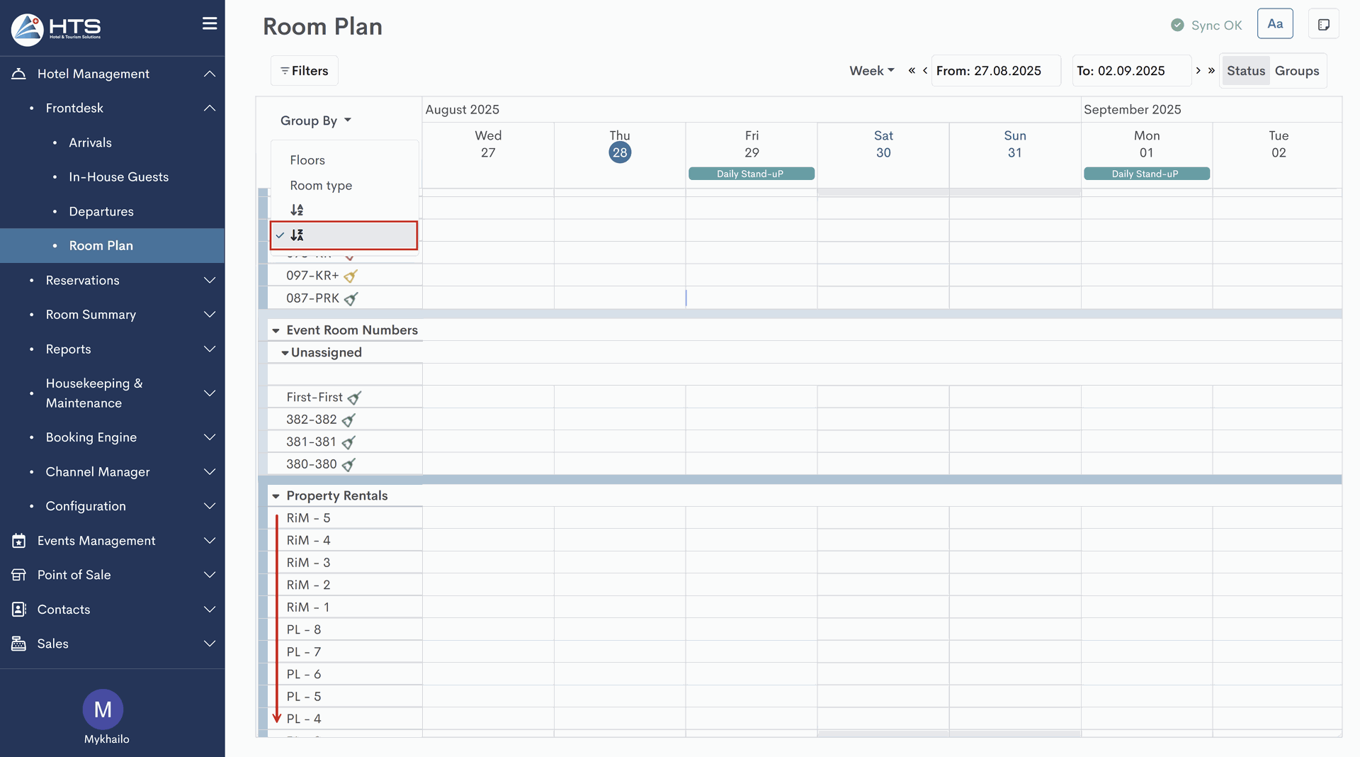 It is essential to note that when applying the 'group by' or 'sort by' options, the system retains all rental property types at the bottom of the room plan, keeping them separate from hotel/event rooms while still applying the selected sorting mode (e.g., Z→A). In a separate article, you can also learn more about applying filters for property types.
