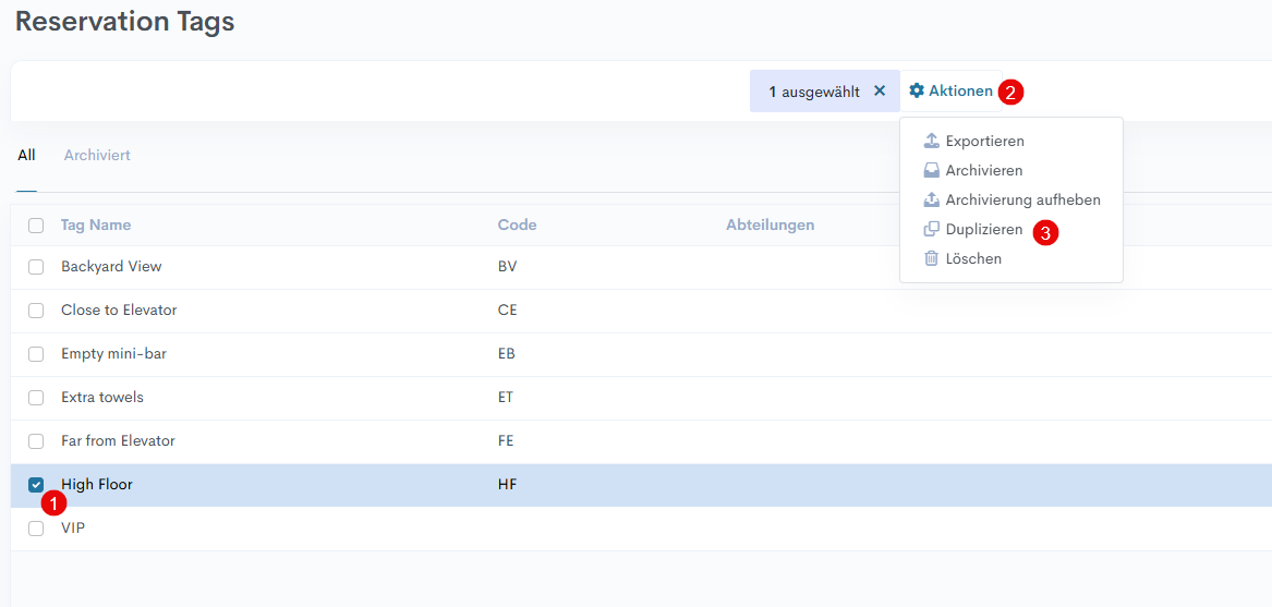 3. Um einen Eintrag zu vervielfältigen, klicken Sie in der entsprechenden Linie auf das Kontrollfeld -> Aktionen -> Duplizieren.