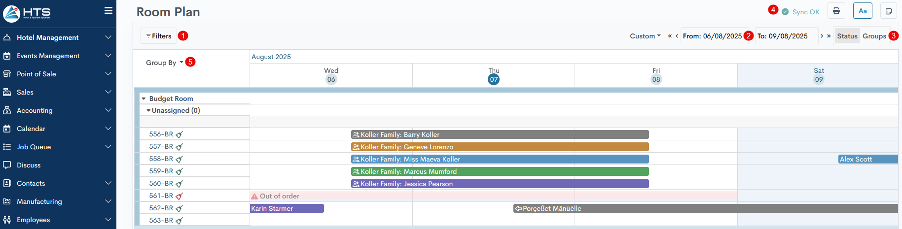 - In the top-left corner of the room plan, you'll find the Filters button, which allows you to filter reservations by five main categories.