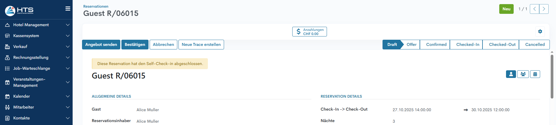 Das System zeigt eine Übersicht über den Reservationssaldo, den Gesamtbetrag, der zu bezahlen ist, sowie das zugewiesene Zimmer an.