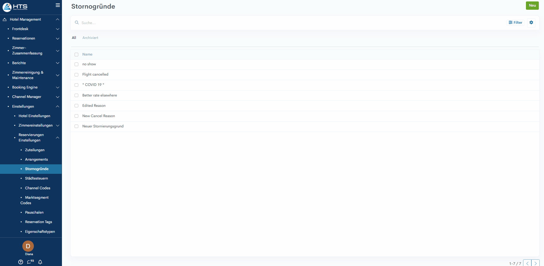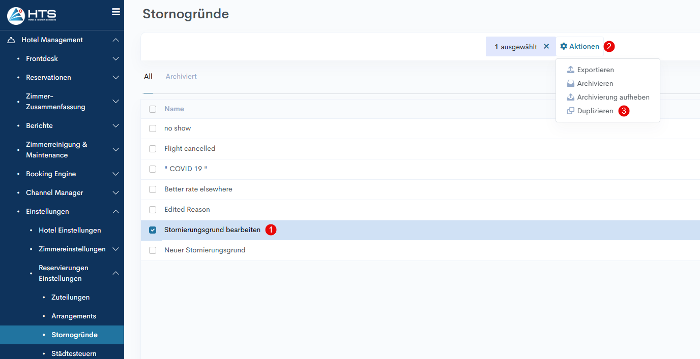 Diese Phase des Anlegens von Stornierungsgründen ist der erste Schritt zur Umsetzung des korrekten Stornierungsprozesses in Ihrem Hotel. Dieser Prozess wird in den folgenden Artikeln ausführlicher beschrieben - So stornieren Sie einzelne Reservationen und so stornieren Sie eine Gruppenreservation.
