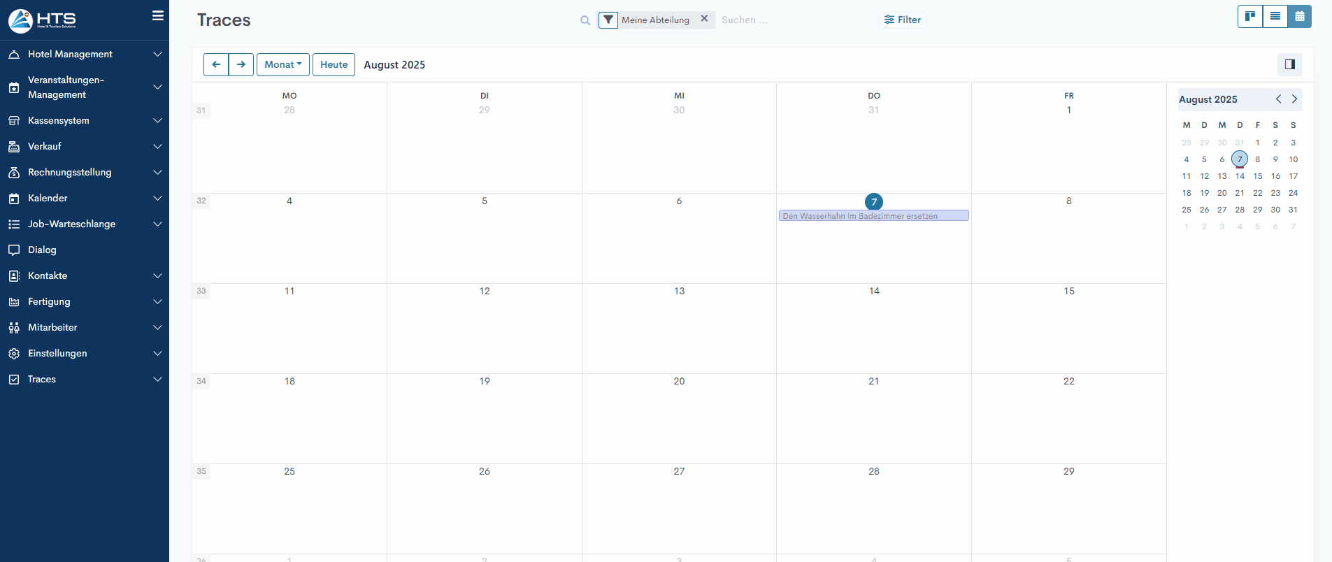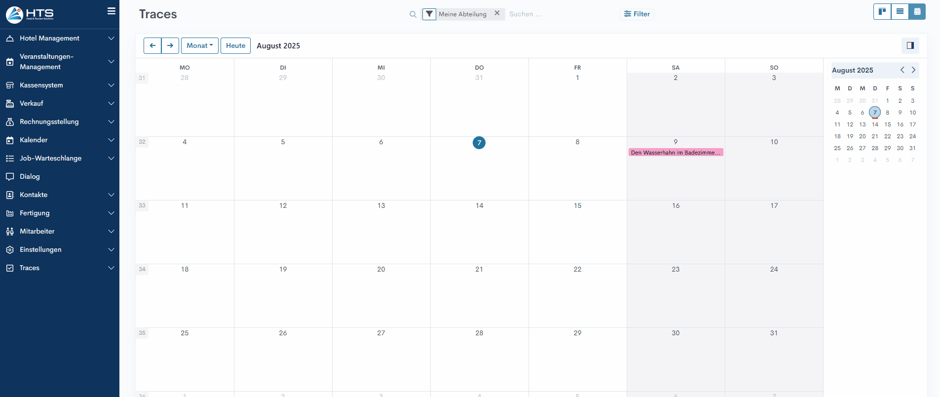 Beim Öffnen der Traces in der Kalenderansicht wird den Benutzern ein Kalender des aktuellen Monats angezeigt, in dem alle relevanten Traces als farbige Balken an ihren jeweiligen Fälligkeitsdaten dargestellt werden. Genau wie in der Kanban- und Listenansicht ist der Standardfilter Meine Abteilung aktiviert, um nur die Traces anzuzeigen, die zur Abteilung des Benutzers gehören.