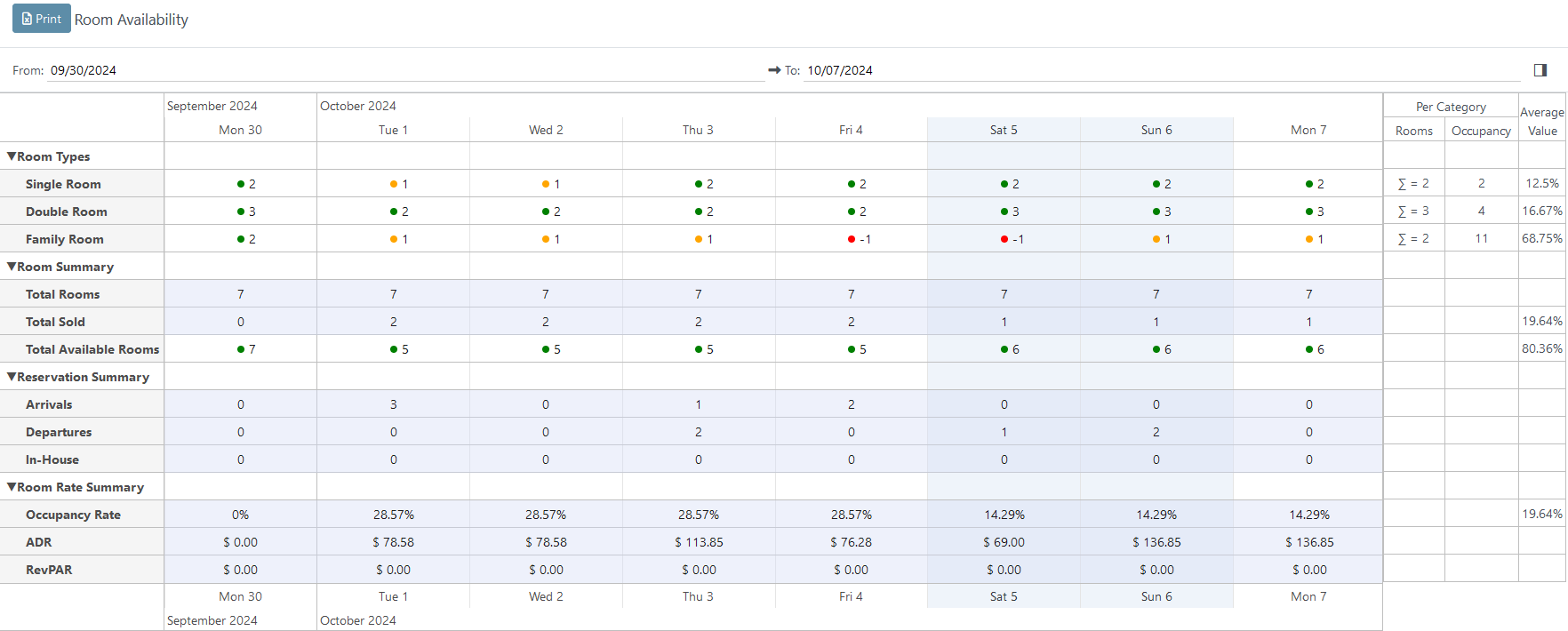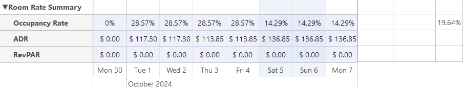 - Zimmerarten - Jede Zimmerart im System hat eine eigene Zeile, in der das System die Anzahl der verfügbaren Räume dieses Raumtyps anzeigt. Am Ende jeder Zeile zeigt das System für jede Zimmerart die Gesamtzahl der Zimmer für den ausgewählten Datumsbereich, die Anzahl der gebuchten Zimmer und die durchschnittliche Belegung für jede Zimmerart an.