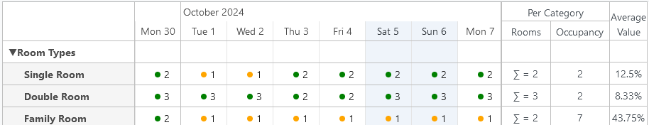 Neben der Anzahl der verfügbaren Zimmer befindet sich ein Indikator, dessen Farbe die Belegung der einzelnen Zimmertypen anzeigt. Grün steht für viele verfügbare Zimmer, gelb für eine mittlere Belegung und rot für eine annähernd volle Belegung.