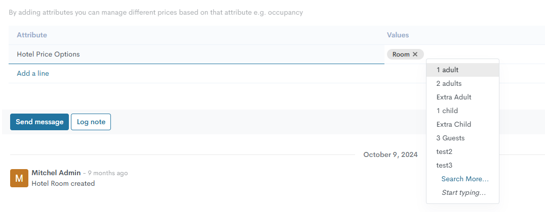 Standardmäßig hat jede Zimmerart eine vordefinierte Hotelpreisoption mit dem Attribut „Zimmer“ - diese Option übernimmt den in der Preisliste festgelegten Preis in die Reservierung, unabhängig von der Anzahl Gäste in der Reservierung. Falls erforderlich, können weitere Optionen hinzugefügt werden. Klicken Sie dazu auf das Feld „Werte“ und fügen Sie einige Optionen aus der Liste hinzu.