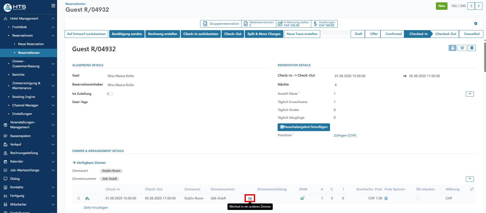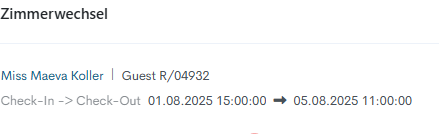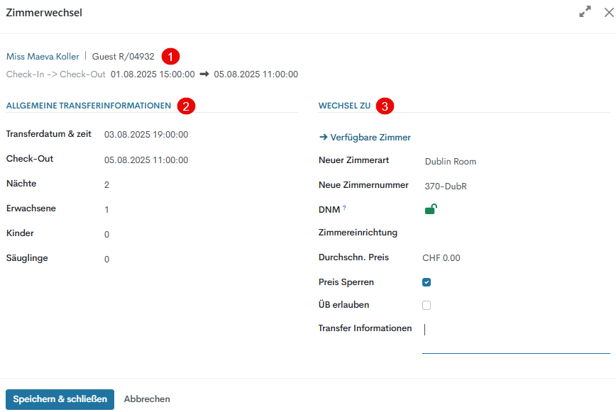 - Transferdatum & zeit – Legen Sie Datum und Uhrzeit fest, zu denen der Gast in ein anderes Zimmer umzieht.