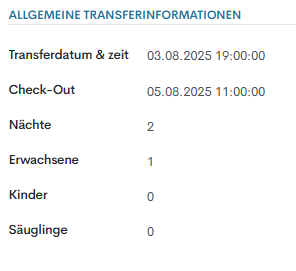 - Nächte – Anzahl der Nächte mit den neuen Daten. Wenn das Transferdatum festgelegt ist und die Anzahl der Nächte geändert wird, passt das System das Abreisedatum entsprechend an.