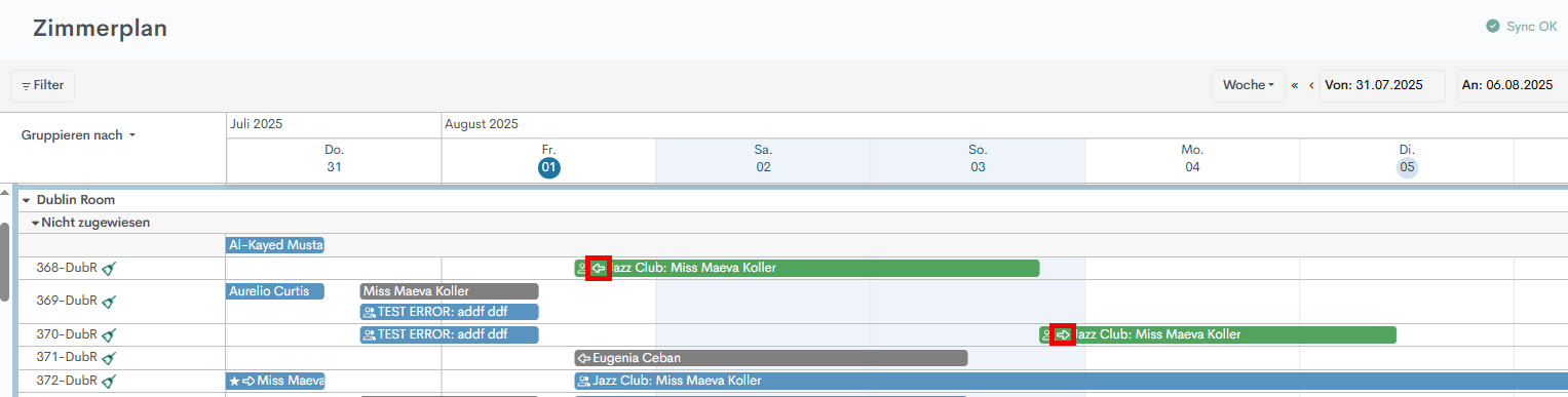 Im Zimmerplan werden für eine bestimmte Zimmernummer zwei verschiedene Balken in einer Reihe angezeigt. Der erste Balken zeigt einen nach rechts gerichteten Pfeil und weist auf einen Umzug in ein anderes Zimmer hin, während der zweite Balken einen nach links gerichteten Pfeil zeigt und einen Umzug aus diesem Zimmer darstellt.
