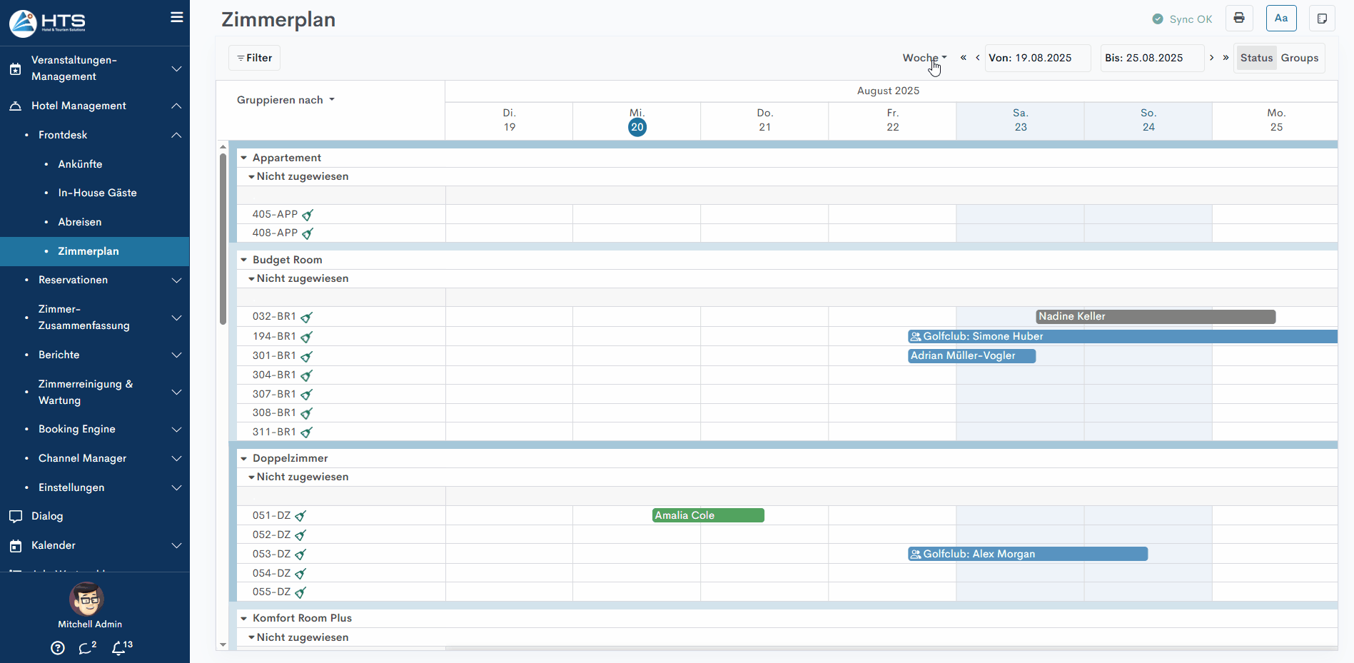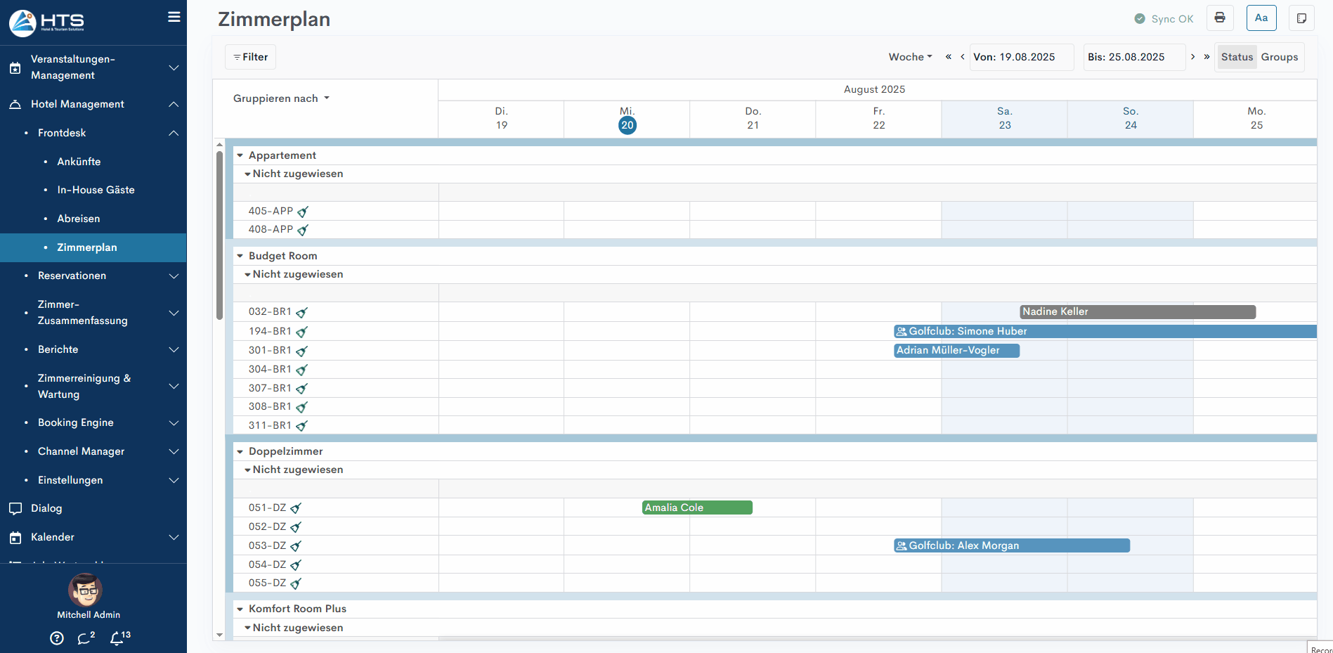 • Clear visualization – color codes, VIP stars, and maintenance and cleaning status at a glance