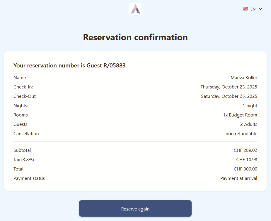 After clicking the Confirm button on the previous step, the guest will see the Confirmation page. At this stage, the guest will receive a reservation number, and a confirmation email will be sent to the main guest’s provided email address. The Reserve Again button will return the guest to the Welcome page.