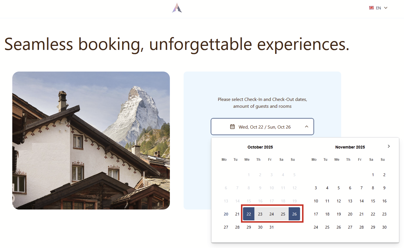 When guests open the hotel booking engine, they are greeted by a welcome page. At the top, the hotel logo is displayed. Below the hotel logo, the Booking Engine motto will be displayed. The page is divided into two sections: on the left, there’s an image of the hotel, and on the right, guests can enter their desired check-in and check-out dates, as well as the number of guests for their reservation and number of rooms.