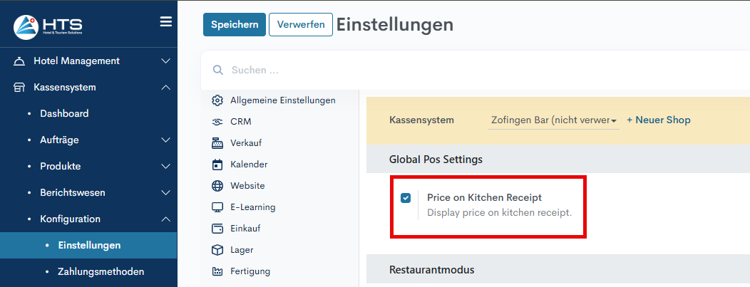 - Aktivieren Sie im Abschnitt Globale Kassensystem-Einstellungen das Kontrollkästchen «Preis auf Küchenbeleg».