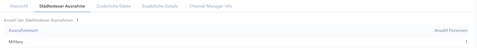 Es gibt vier Registerkarten unter dem Abschnitt „Zimmer & Arrangement“ - „Übersicht“ (standardmäßig geöffnet), „ Stadtsteuer Ausnahme“, „Zusätzliche Gäste“ und „Zusätzliche Details“.