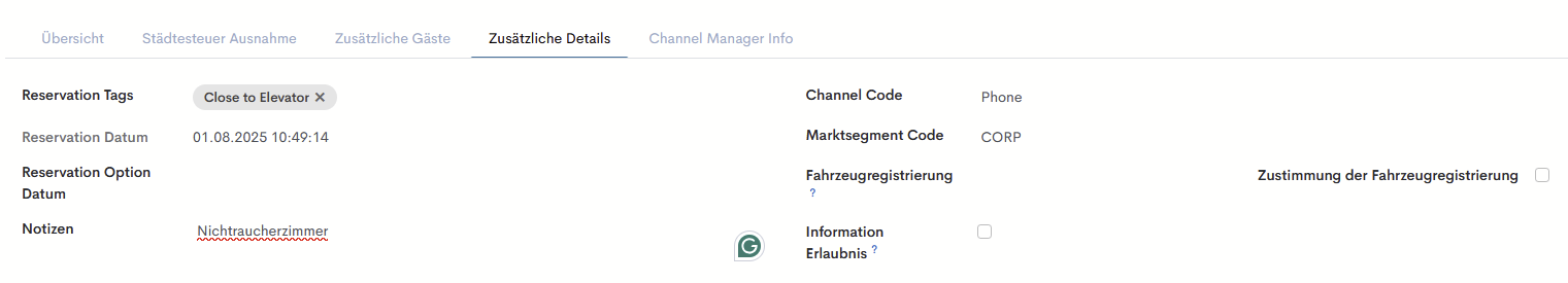 - Alle anderen Details der Reservierung können vom Benutzer in den entsprechenden Feldern auf der Registerkarte 'Zusätzliche Details' angegeben werden: